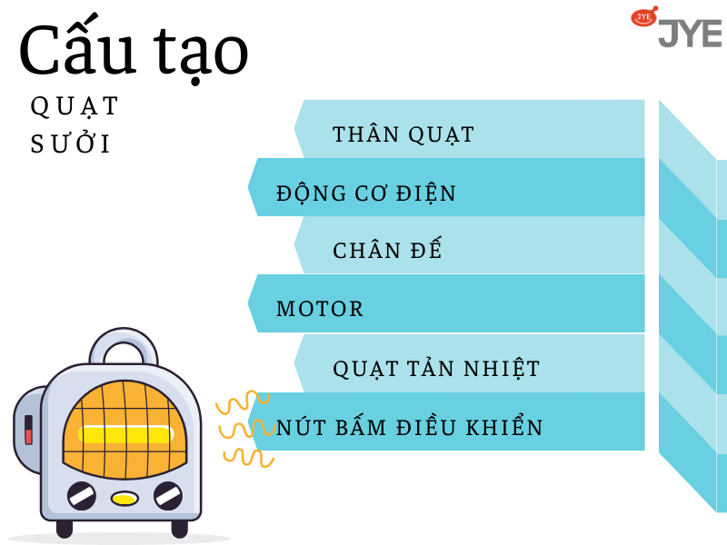Quạt sưởi cũng có cấu tạo tương tự như những chiếc quạt điện làm mát thông thường. Tuy nhiên, quạt sưởi sẽ có thêm một số bộ phận khác thực hiện chức năng sưởi ấm.